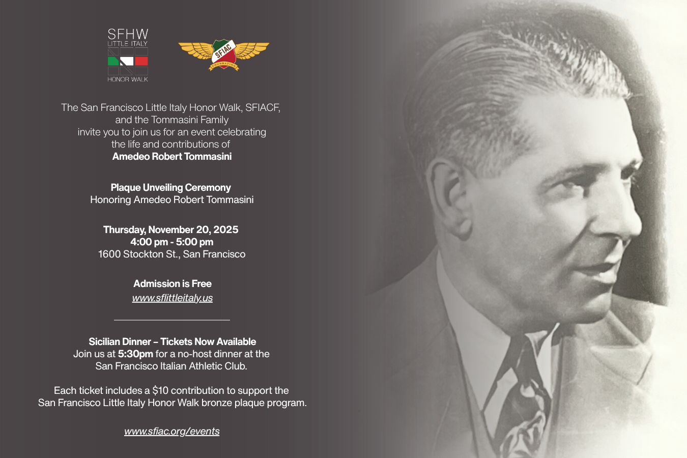 UPCOMING EVENTS A Christmas and Awards Gala Wednesday, December 10th, 2025 - 6:30-9:30pmThe St. Francis Yacht Club99 Yacht Rd., San Francisco, CA 94133Cost per person: $250LDVS Member: $200Table for 8: $1,500 LIVE MUSICwithClaudio Melega Details Register San Francisco Little Italy Honor WalkHonorsAmedeo Tommasini Thursday, November 20th, 2025, 4:00-5:00pm1630 Block of Stockton St.Free Admission Details PAST EVENTS Pasolini, a Filmmaker’s Journey Thursday, November 13th, 2025 - 6:30pmCasa Fugazi, Italian Community Services678 Green St., San Francisco, CA 94133General Admission: $10Free Admission for Leonardo Members | Registration Required Details Ferlinghetti for San Francisco Saturday, October 18th, 2025 - 11:00amThe Legion of Honor100 34th Avenue, San Francisco, CA 94121General Admission: $10Free Admission for Leonardo Members | Registration Required Details Thursday, October 16th, 2025 - 6:30pmItalian Cultural Institute/INNOVIT710 Sansome St., San Francisco, CA 94111In collaboration with The Italian Cultural InstituteFree Admission | Registration Required Book Presentation“Trema la notte”( The Night Trembles)by Nadia Terranova Details Book Club“Quello Che So di Te” by Nadia Terranova Thursday, October 16th, 2025 - 5:00pmItalian Cultural Institute/INNOVIT710 Sansome St., San Francisco, CA 94111In collaboration with The Italian Cultural InstituteFree Admission | Registration Required Details Andrea Camilleri’s 100th Year Birth Anniversary Tuesday, October 14th, 2025 - 6:30pmItalian Cultural Institute/INNOVIT710 Sansome St., San Francisco, CA 94111Free Admission | Registration RequiredIn collaboration with The Italian Cultural Institute Details Viva Verdi! Friday, September 20th, 2025 - 10:30am - 3:30pmMuseo Italo AmericanoFort Mason, Building C - 2 Marina Blvd, San Francisco, CA 94123Presented by the Museo Italo Americanowith the support of theLeonardo da Vinci SocietyLeonardo and Museo members: $40Non member: $75 Details Ligabue Thursday, May 22nd - 6:30pmMuseo Italo AmericanoFort Mason, Building C - 2 Marina Blvd, San Francisco, CA 94123Free Admission For Museo and Leonardo Members | Registration Required Details Carlo Fierens: Homage to Paganini Thursday, April 24th, 2025 - 6:30pmItalian Cultural Institute/INNOVIT710 Sansome St., San Francisco, CA 94111Free Admission | Registration Required Details The Italian Saxophone Quartet Thursday, April 1st, 2025 - 12:30pmOld St. Mary's Cathedral660 California St., San Francisco, CA 94108Free Admission Details Sounds and Stories of Monti Ernici Thursday, March 13th, 2025 - 6:30pmMuseo Italo AmericanoFort Mason, Building C - 2 Marina Blvd, San Francisco, CA 94123Free Admission | Registration Required Details Carnevale Dinner 2025 Tuesday, March 4th, 2025 - 6:00pmDonato&Co. Restaurant2635 Ashby Ave., Berkeley, CACost per person: each orders and pays for food and drinks Details Amir Issaa Wednesday, February 26th, 2025 - 6:30pmItalian Cultural Institute/INNOVIT710 Sansome St., San Francisco, CA 94111Free Admission | Registration Required Details Cristiana PegoraroIn Concert Thursday, January 30th, 2025 - 6:30pmItalian Cultural Institute @INNOVIT730 Sansome Street, San FranciscoIn collaboration with the Italian Consulate General and the Italian Cultural Institute Details Christmas Gala & Awards Ceremony - 75th Anniversary Thursday, December 12th, 2024 - 6:00-9:30pmThe ST Francis Yacht Club99 Yacht Rd., San Francisco, CA 94133Cost per person: $200LDVS Member: $175Table for 8: $1,400 Details Opening of the Play “Lettere d’Amore” by Dacia Maraini interpreted and produced by Francesca Fanti Saturday, November 16th, 2024 - 8:00pmThe Marsh Theater1062 Valencia, San FranciscoIn collaboration with The Italian Cultural Institute Details In Search of Abundance: mountain of Cheese, Rivers of Wine and other Gastronomic Utopias Thursday, November 14th, 2024 - 6:00pmMuseo Italo Americano Fort Mason, Building C - 2 Marina Blvd, San Francisco, CA 94123Admission: Free for LDVS and Museo members - $10 for General public Details Puccini at 100: A Symposium in Honor of the Italian Composer Saturday, October 19th, 2024 - 10:30am – 3:30pmMuseo Italo Americano Fort Mason, Building C - 2 Marina Blvd, San Francisco, CA 94123 Details Week of the Italian Language in the World 2024: Books, Creativity and AI. What’s next?? Thursday, October 3rd, 2024 - 6:30 pmItalian Cultural Institute730 Sansome Street, San FranciscoFree Admission | Registration Required Details Alfresco Luncheon & Elections 2024 Saturday, June 8th, 2024 | 12:30 - 3:00pmTerun Restaurant448 California Ave, Palo Alto, CAProsecco & Antipasto Assembly: 12:30-1:pmFree for members | Luncheon : 1:30-3:00 pm - $50Registration Required Details Echoes of Venice: A resident's Journey Through Time and Space Wednesday, May 29th, 2024 - 6:00pmMuseo Italo AmericanoFort Mason, Building C - 2 Marina Blvd, San Francisco, CA 94123Free Admission | Registration Required Details Did Marco Polo ever go to China? Tuesday, April 23rd, 2024 - 6:00pmMuseo Italo AmericanoFort Mason, Building C - 2 Marina Blvd, San Francisco, CA 94123Free Admission | Registration Required Details Book Presentation Wednesday, March 27th, 2024 - 6:00pmThe Girl Who Said No by Natalie Galli, the author in person!In collaboration with Telegraph Hills Arts and Literature Telegraph Hill Books1501 Grant Ave., San Francisco, CA 94133 Details Screening of Vittorio De Sica's “Ieri, Oggi, Domani” Tuesday, March 19th, 2024 - 6:30pmClub Fugazi678 Green St., San Francisco, CA 94133 Details Galileo Galilei: A Multifaceted Exploration of Writings, Music and Equations Friday, March 15th, 2024 - 6:30pmItalian Cultural Institute/INNOVIT710 Sansome St., San Francisco, CA 94111 Details A Fistful of Music: An Ennio Morricone Retrospective March 1st-14th, 2024Ennio: A documentary directed by Giuseppe TornatoreFollowed by a series of 14 films (See Details) The 4 Star Theater2200 Clement St., San Francisco, CA 94121 Details Book Presentation Thursday, F